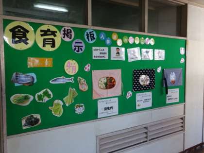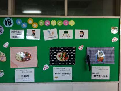 中央校舎2階の食育掲示板です。4月はコロナウィルス感染症を予防するために。