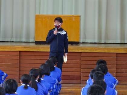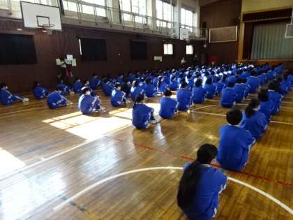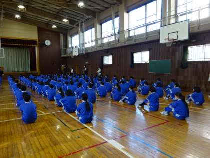 2年・3年生を集めて、臨時の朝礼を行いました。今日から部活動の活動時間を6:30まで延ばすことにあわせて、感染症対策等を再度確認しました。