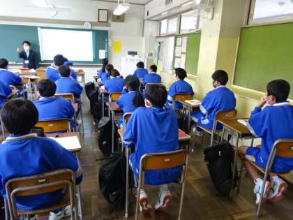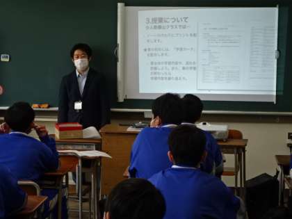 今日から時間割通りの授業が始まりました。最初の授業なので、教科担当の先生が、授業の進め方や評価評定の方法などを話していました。1年1組、数学。