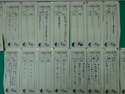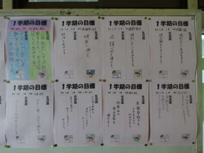 それぞれの学年クラスごとに1学期の目標が廊下に掲示されています。保護者会などで学校にいらっしゃった際にぜひご覧ください。。