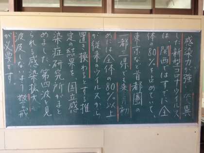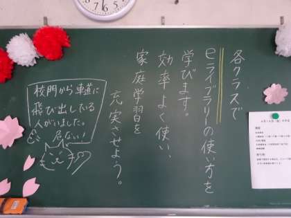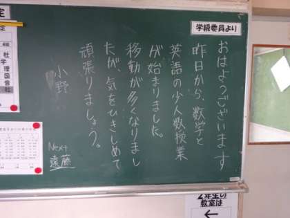 学年掲示板。移動が多くなりました(2年)。家庭学習を充実させよう(1年)。警戒が必要(3年)。