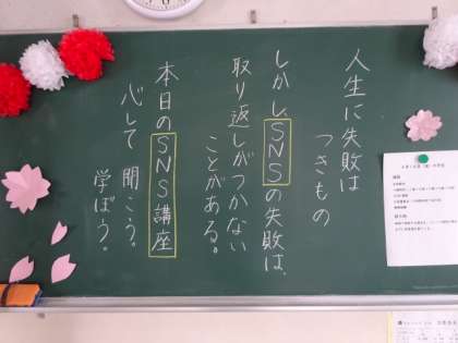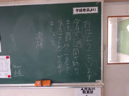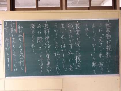 学年掲示板。最後の一日(2年)。心して聞こう学ぼう(1年)。気の利く行動(3年)。