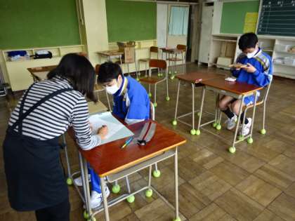 7組、美術。木彫に入ります。その前に、ぞうきんの絞り方。