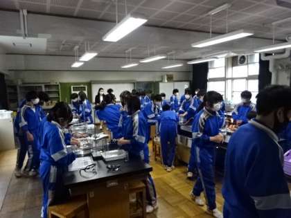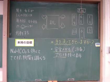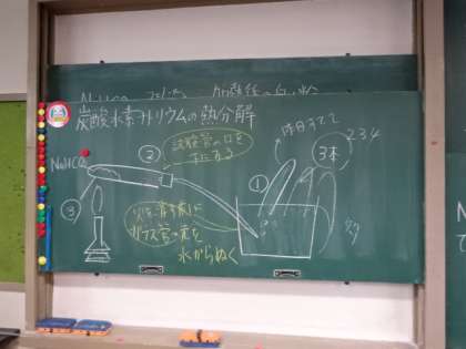 2年1組、理科。「炭酸水素ナトリウムの熱分解」