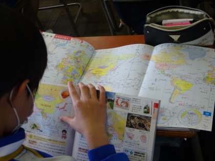1年2組、社会。「いろいろな国の国名と位置」国とその位置をつかむにはどのようなことに注目すればよいか。