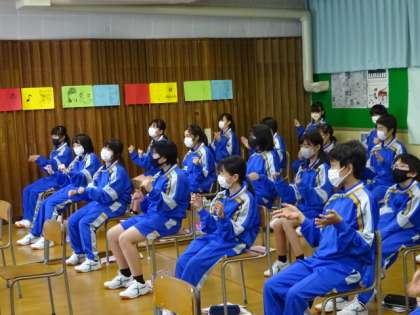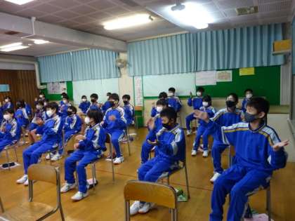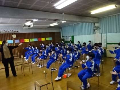 1年4組、音楽。校歌の指揮の練習をしていました。
