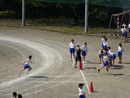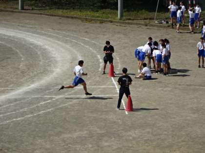 3年3・4組、体育。50m走の記録を計測していました。