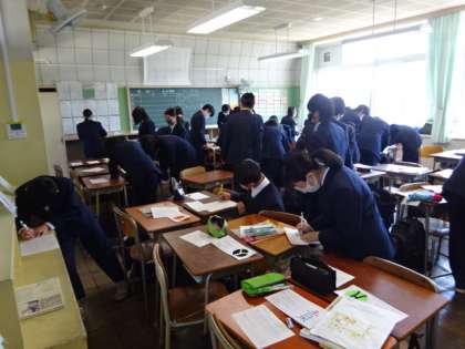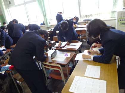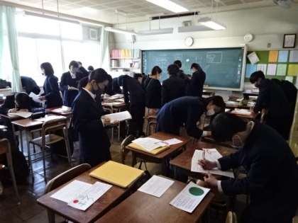 2年3組、美術。「自分のマークのデザイン」鑑賞会。