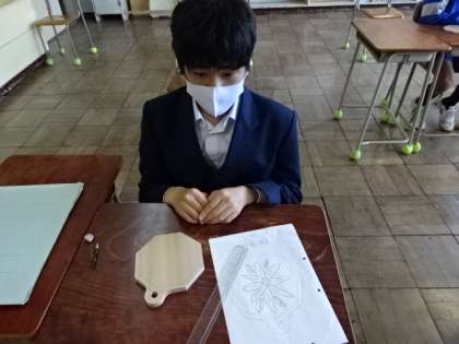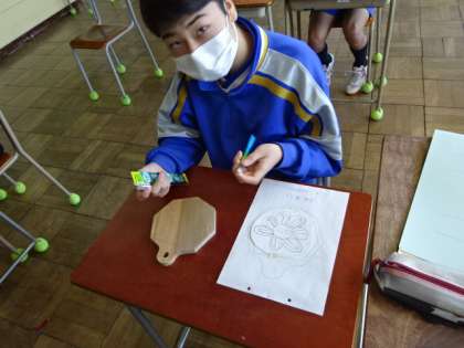 7組、美術。「花のデザインの木彫なべ敷き」
