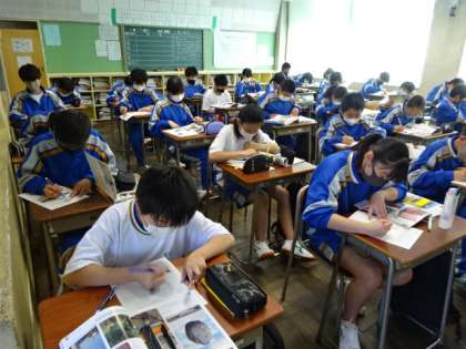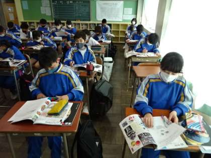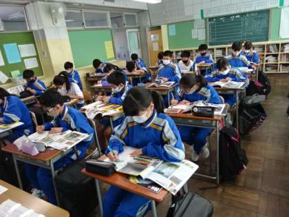 1年3組、美術。第1回模写クイズ大会の作品制作中です。「資料集から有名な作品をたくさん知ろう!」