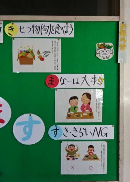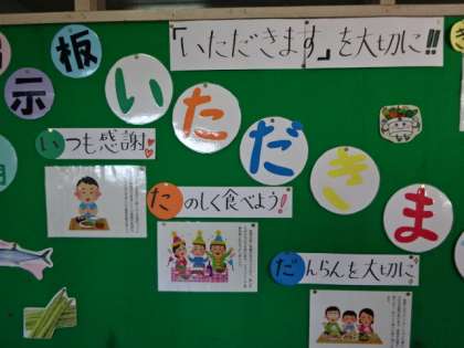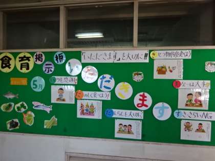 5月の食育掲示板です。「いただきます」を大切に‼ 「い」つも感謝 「た」のしく食べよう 「だ」んらんを大切に 「き」せつ物(旬)を食べよう 「ま」なーは大事 「す」ききらいNG。