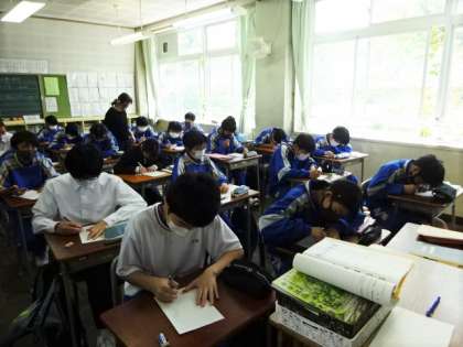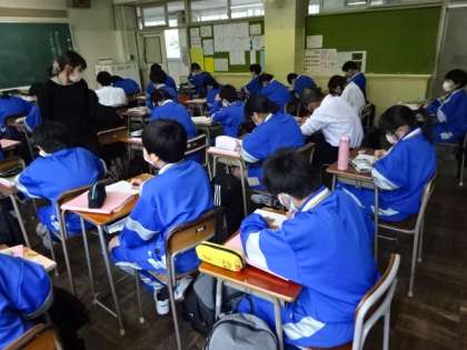 1年5組、国語。「200字作文 あなたの学級のよいところを1つ上げて紹介しなさい」