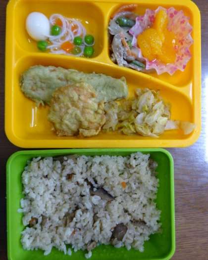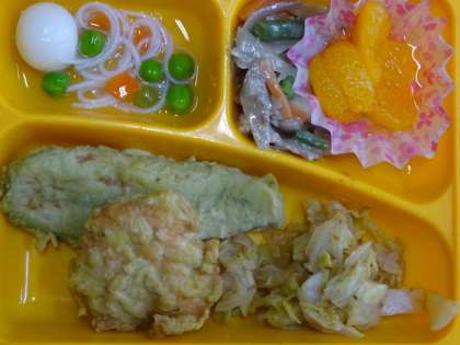 今日の給食は「桑都御膳」です。「かてめし」八王子の郷土料理。かては混ぜるという意味です。「桑都揚げ」桑の葉粉末を混ぜた衣をつけて揚げました。「絹のあんかけ白玉」白玉団子を蚕の繭、そうめんを絹糸にみたてたあんかけです。