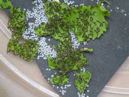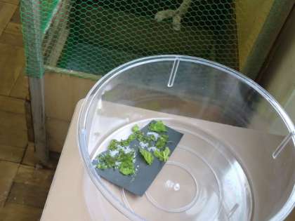 事務室前の蚕が卵からかえり、幼虫の姿を見せています。