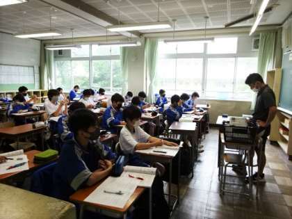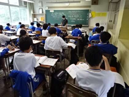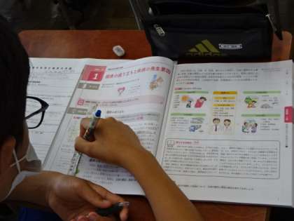 1年3・4組、体育男子。今日は保健の学習です。「病気になる原因を知り病気を予防する」「食生活が健康に与える影響について知る」