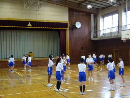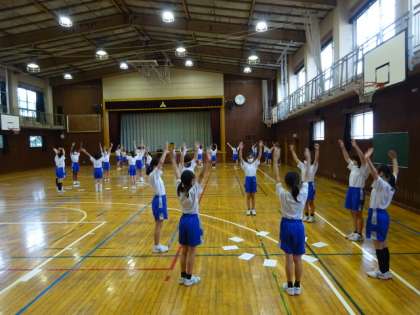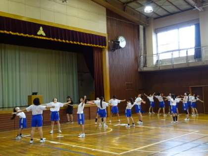 1年3・4組、体育女子。これからラジオ体操のテストがあるそうです。グループで練習していました。