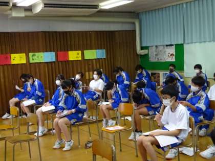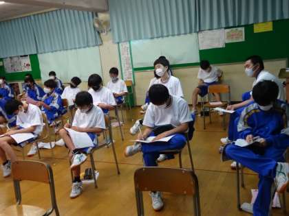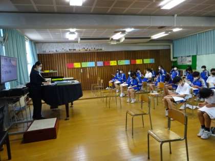1年5組、音楽。「作曲者が情景をどのように表現しているかに注目しながら鑑賞しよう」ヴィヴァルディの「四季 春」を鑑賞したようです。