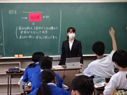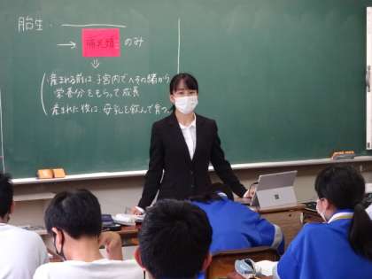 1年5組、理科。教育実習の大学生が授業を行っていました。