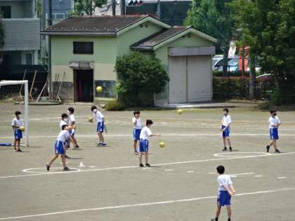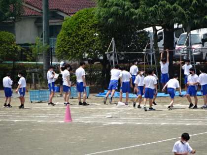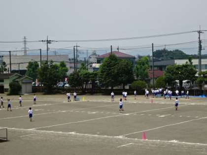 2年3・4組、体育男子。ハンドボール投げと立ち幅跳び。体力テストです。