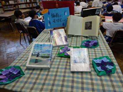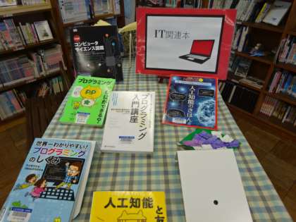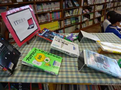 図書室の特集コーナーです。「梅雨にむけて」「IT関連本」