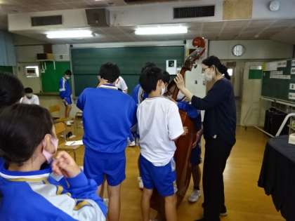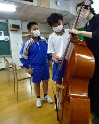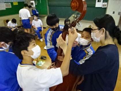 1年1組、音楽。順番に、コントラバスに触れてみよう。鳴らしてみよう。