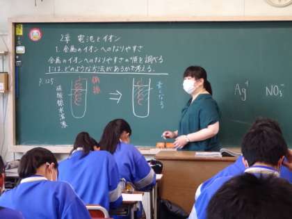 3年4組、理科。「電池とイオン 金属のイオンへのなりやすさの順を調べるには、どのような方法があるかを考える」