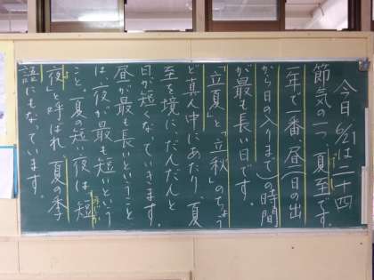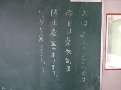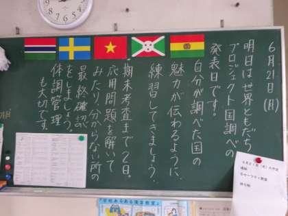 学年掲示板。世界ともだちプロジェクト(1年)薬物乱用防止教室(2年)夏至(3年)。