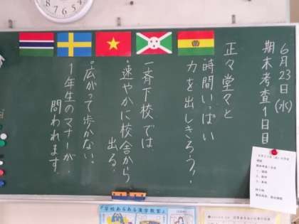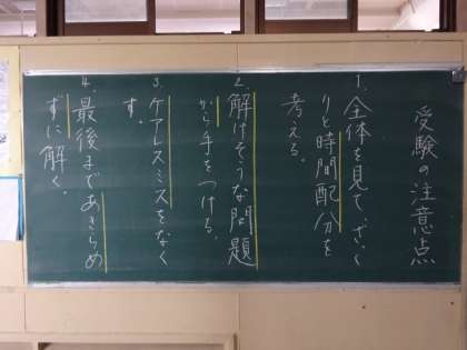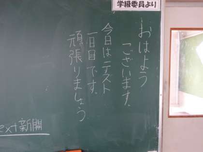 学年掲示板。正々堂々と(1年)テスト1日目(2年)受験の注意点(3年)。