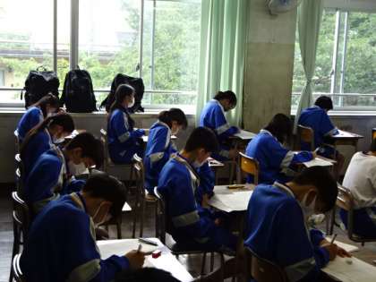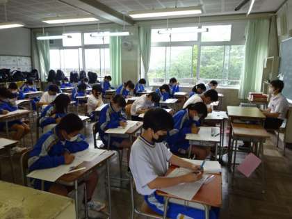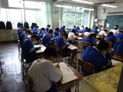 期末考査最終日になりました。1時間目の社会のテストです。1年1組。