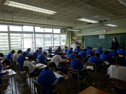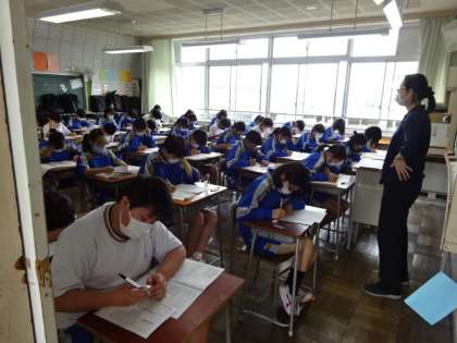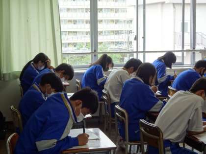 期末考査最終日になりました。1時間目の社会のテストです。2年1組。