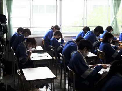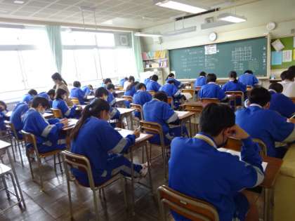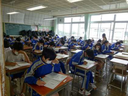 期末考査最終日になりました。1時間目の社会のテストです。2年4組。