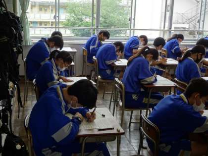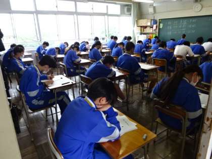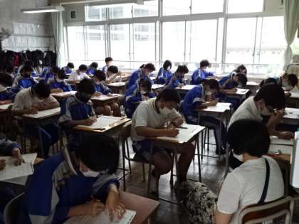 期末考査最終日になりました。1時間目の社会のテストです。3年1組。