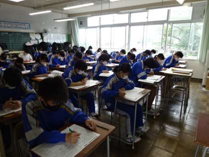 期末考査最終日になりました。1時間目の社会のテストです。3年4組。