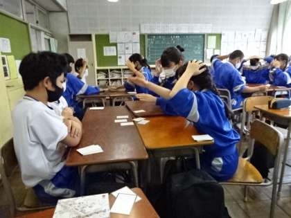 1年5組、国語。「桑都八王子かるた」をしています。