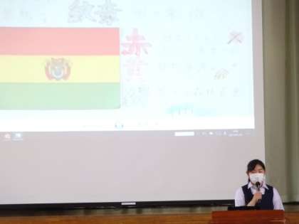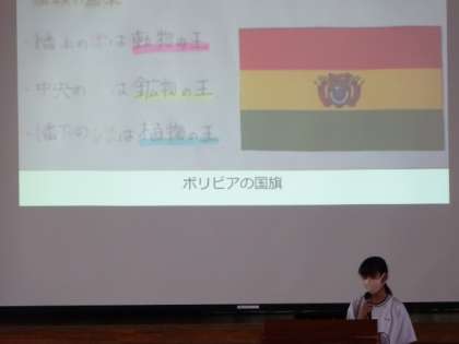 1時間目の学年集会の様子です。世界ともだちプロジェクトで調べた国の発表です。