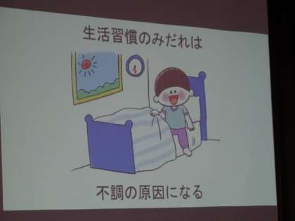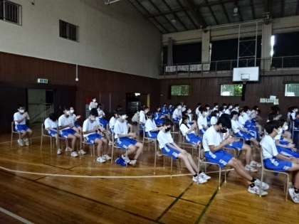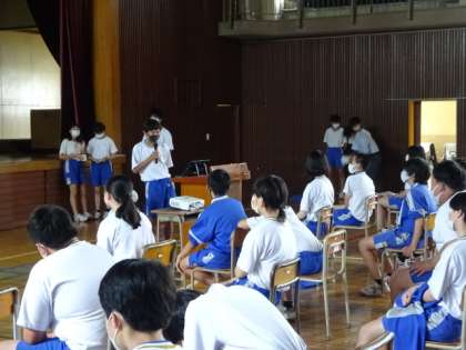 2時間目、2年生の学年集会です。保健委員会「夏休み体調不良あるある」。