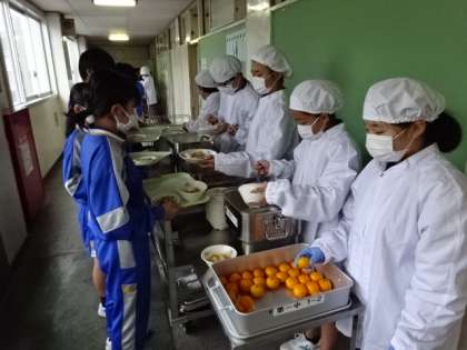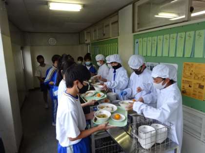昨日から始まったセンター給食。今日はどの学年もとてもスムーズに準備できました。1年生の様子です。