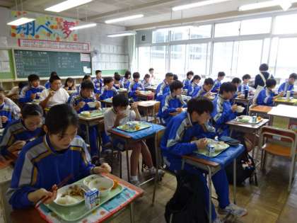 今日のメニューは「焼き鳥丼」。3年生。