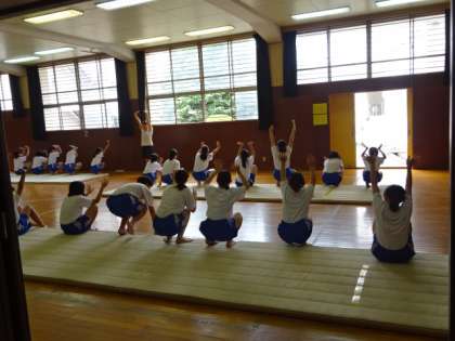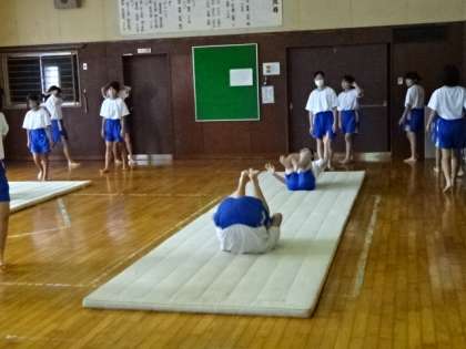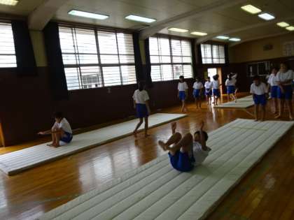 1年1・2組、体育女子。マット運動です。