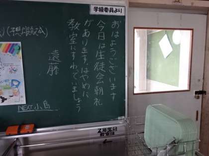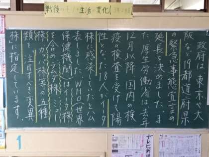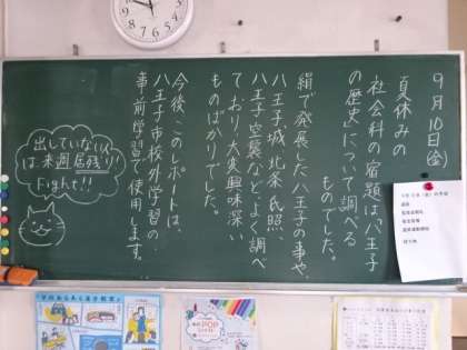 学年掲示板。八王子の歴史(1年)。生徒会朝礼(2年)。宣言の延長(3年)。