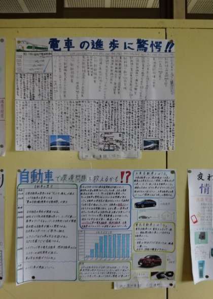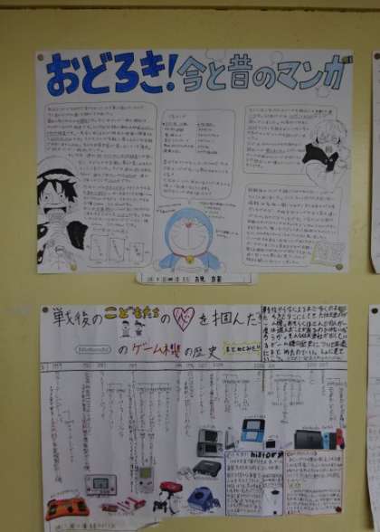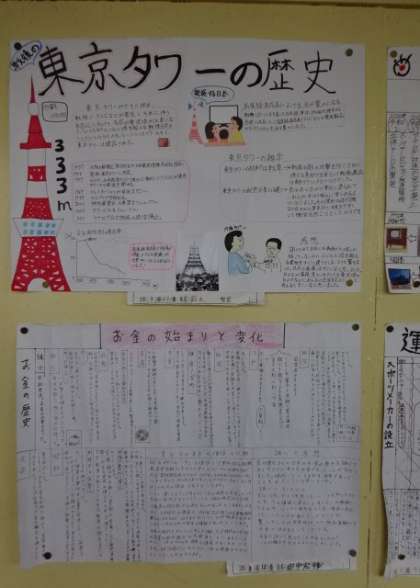 今3年生の廊下に掲示されている社会科の夏休みの宿題です。「戦後のモノや生活の変化」についてまとめています。3組。