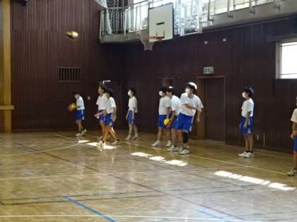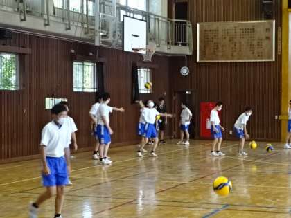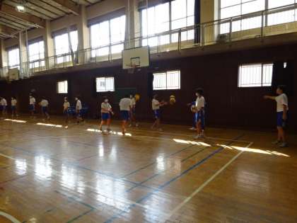 2年1・2組、体育男子。バレーボールのサーブの練習。