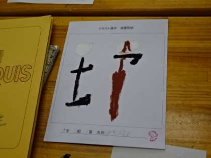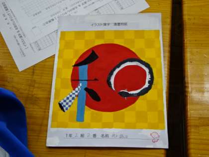1年2組、美術。「イラスト漢字」作品鑑賞会。