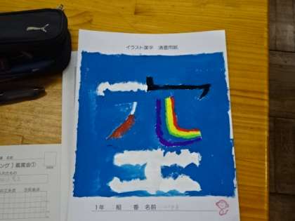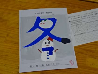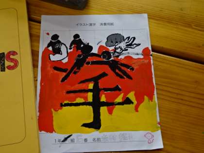 1年2組、美術。「イラスト漢字」作品鑑賞会。