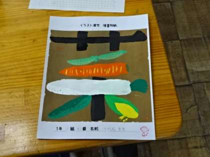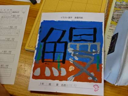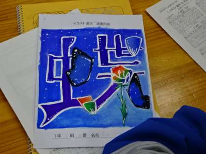 1年2組、美術。「イラスト漢字」作品鑑賞会。