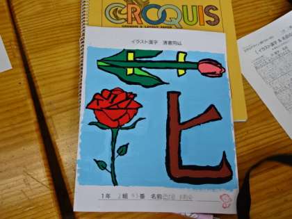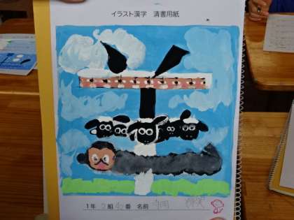 1年2組、美術。「イラスト漢字」作品鑑賞会。