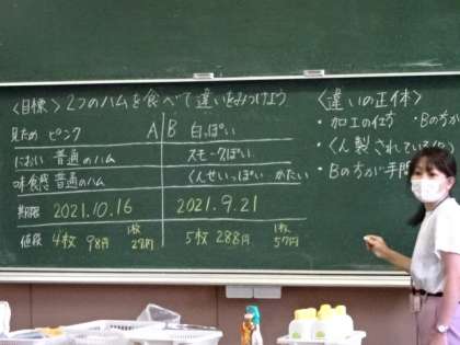 1年3組、家庭科。「2つのハムを食べて違いをみつけよう」