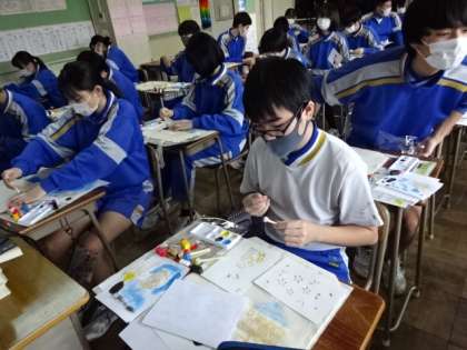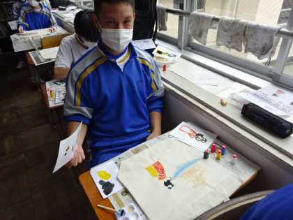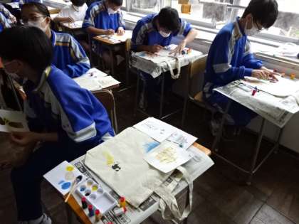 3年生が修学旅行の代替で「修学旅行オンライン体験学習」を行いました。型友禅、漆工芸、京扇子の制作に取り組みました。