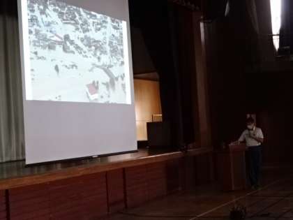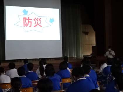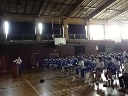 残念ながら今年の総合防災訓練も、感染症対策のために実地はできません。変わりに、「東京消防庁八王子消防署小宮出張所長」に学年ごとに講演していただきました。3年生と7組の様子です。