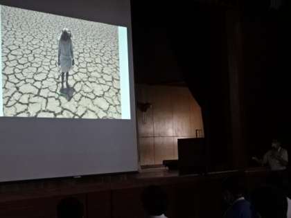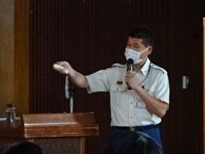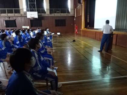 残念ながら今年の総合防災訓練も、感染症対策のために実地はできません。変わりに、「東京消防庁八王子消防署小宮出張所長」に学年ごとに講演していただきました。3年生と7組の様子です。